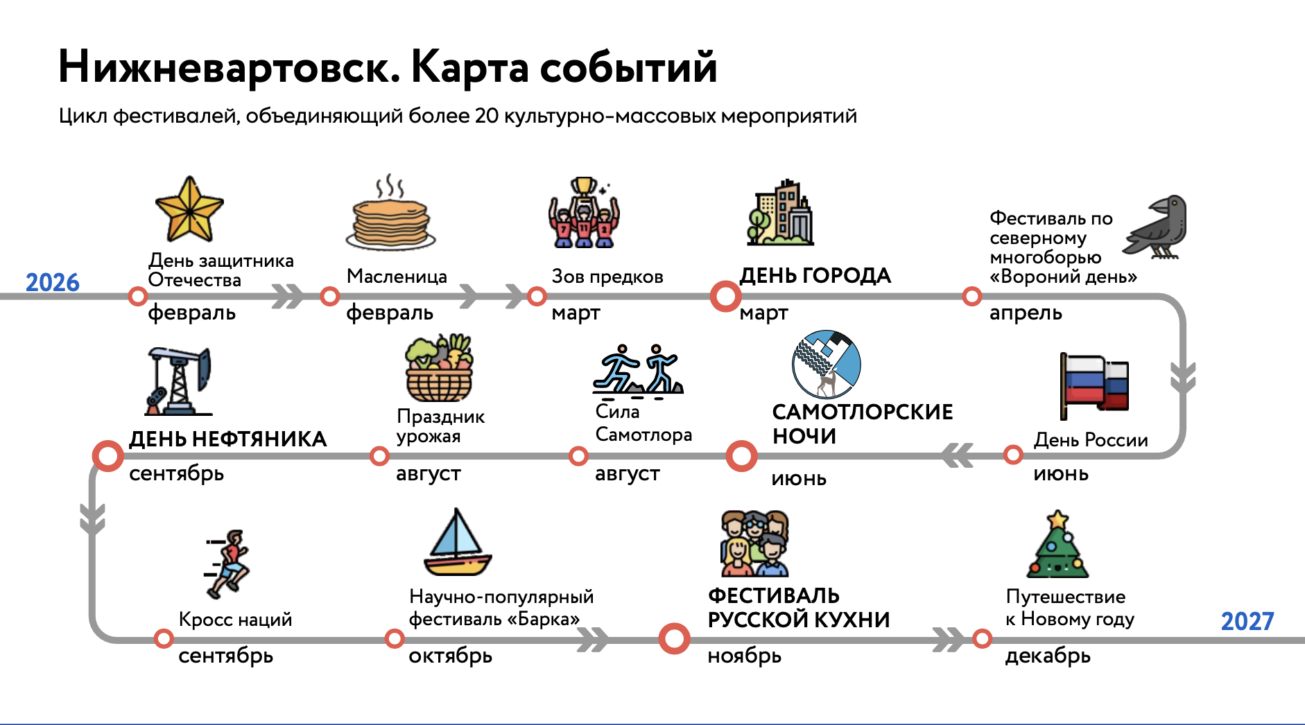 В этом году Нижневартовск продолжит принимать федеральные коллективы в рамках гастрольной карты Югры и программы «Пушкинская карта». Уже состоялся концерт «Виртуозов Москвы», 13 мая выступит Донецкий академический симфонический оркестр имени Прокофьева. Городские коллективы, в свою очередь, представляют город на престижных конкурсах и фестивалях, включая международный фестиваль «Дух огня».